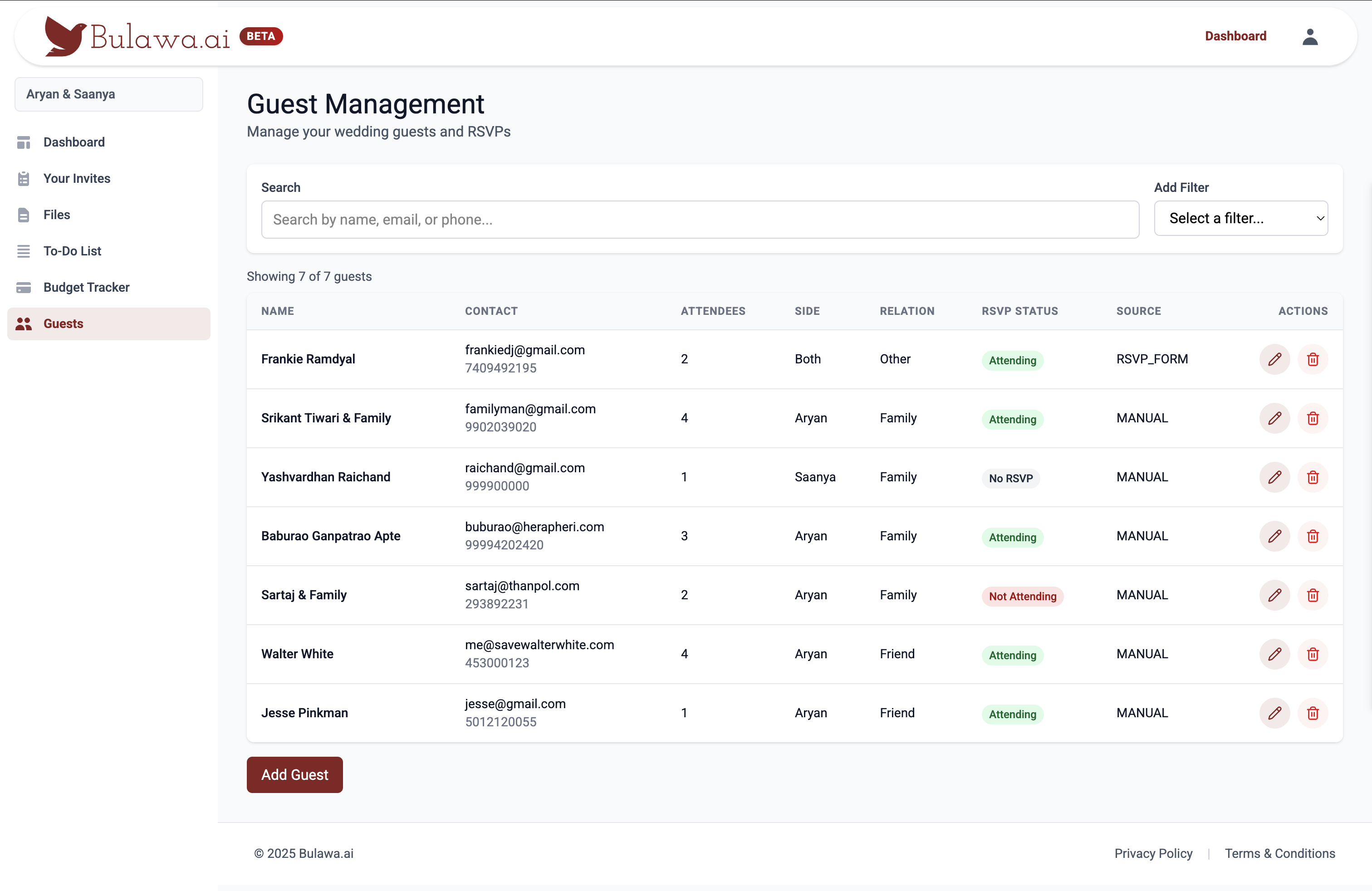 Simplify the way you manage your wedding guests. Keep all guest details in one place, monitor RSVPs in real time, and ensure nothing falls through the cracks.